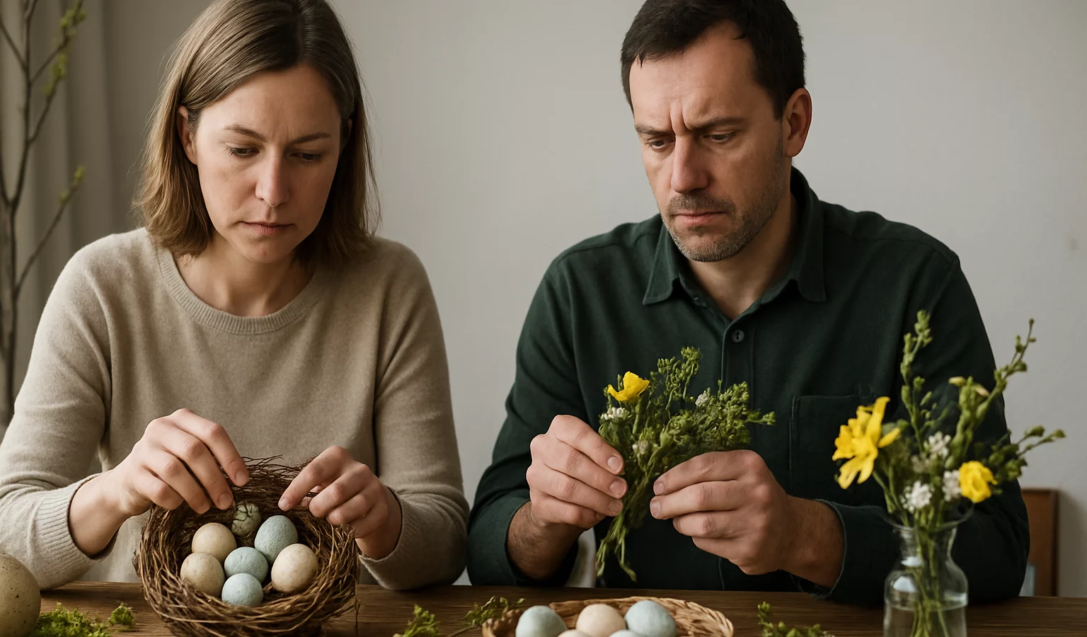 Enfin, composez une palette pastel et des détails discrets: mini pots, mousse naturelle, œufs décoratifs et verdure discrète pour une atmosphère apaisante et festive.